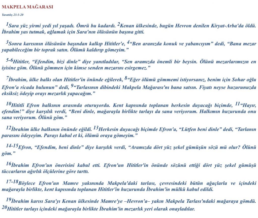 Hz. İbrahim’in dört bin yıl kadar önce karısı Sara’nın öldüğü o gün, sonradan kendisinin ve Oğlu İshak ve onun oğlu Yakup’un gömüleceği Makpela mağarasını dört yüz şekel gümüş karşılığında Hitti Efron’dan satın aldığı bu mağara Yahudilerin Kenan diyarında şimdiki adıyla El Halil’de edindikleri ilk mülktür.